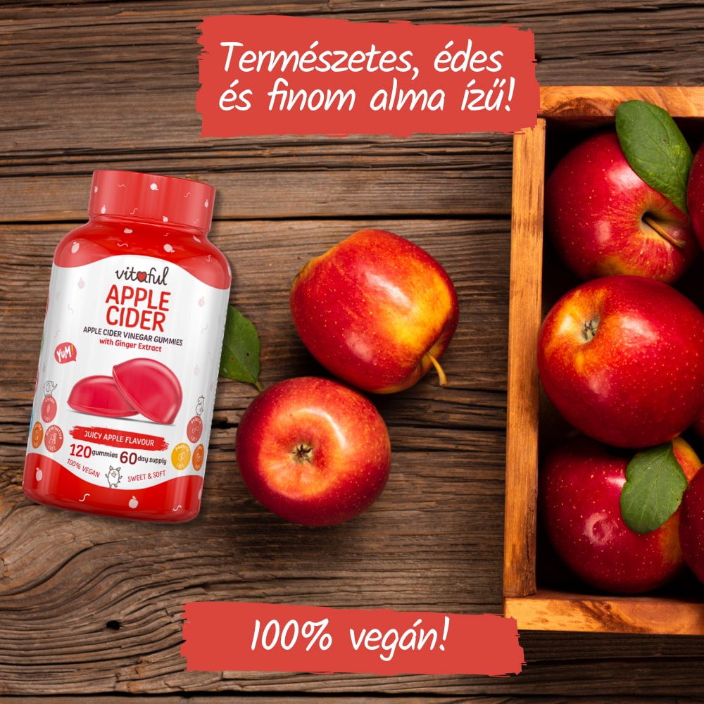 Az állagában és ízében az Apple Cider egy finom, zselés, almás-gyömbéres ízű igazi csemege, szemben egy nagy, száraz, nehezen nyelhető tablettával. Ezen kívül 100% vegán, laktóz-, szója- és gluténmentes, nem tartalmaz tartósítószert, sem mesterséges színezéket!