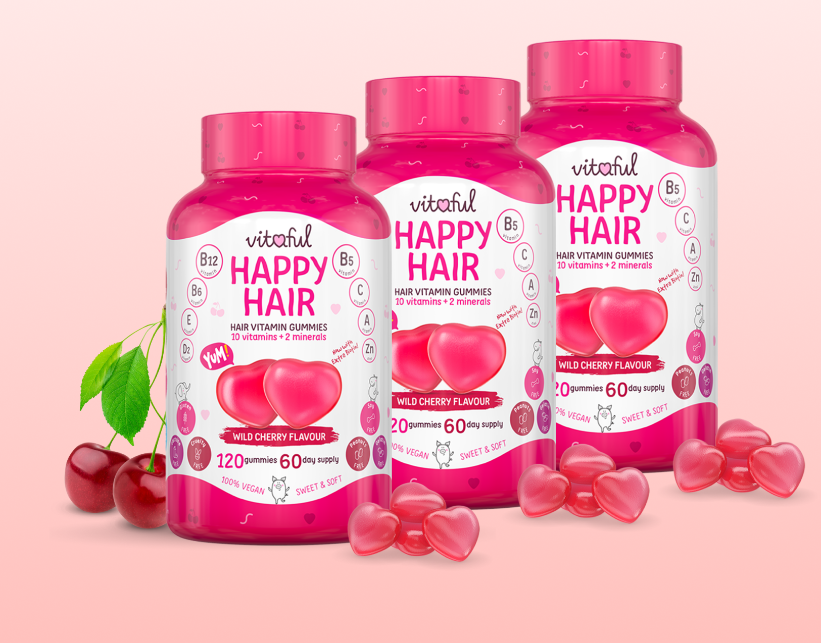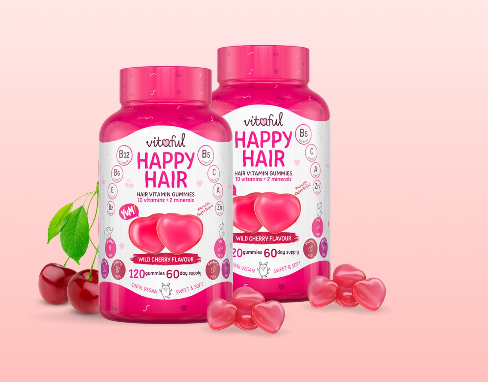 A Happy Hair egy könnyen fogyasztható, szív alakú gumivitamin, amely magas biotin-, A-, B-, C-, E- és D-vitamin tartalommal rendelkezik, vadcseresznye ízben.